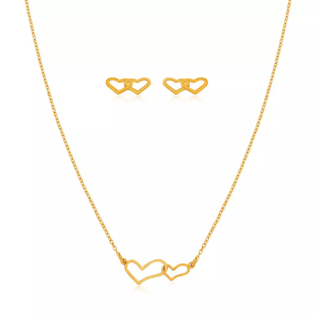 CONJUNTO COLAR + BRINCO DOIS CORAÇÕES - FOLHEADO A OURO