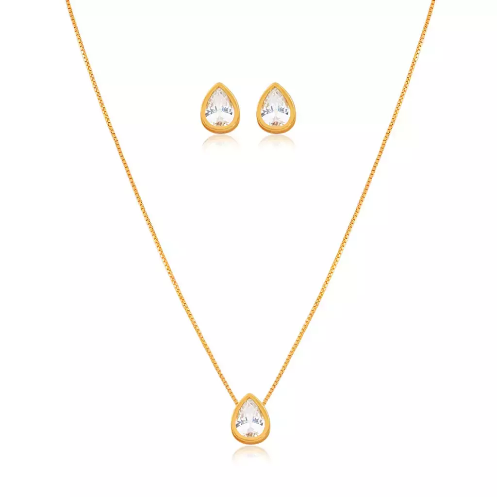 CONJUNTO COLAR + BRINCO GOTA ZIRCÔNIA - FOLHEADO A OURO