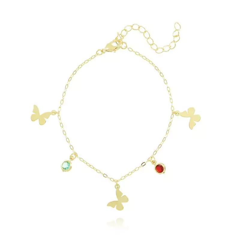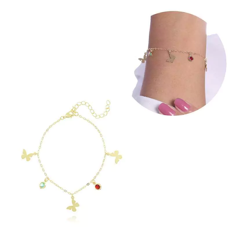PULSEIRA COM PINGENTES DE BORBOLETA COM ZIRCÔNIA COLORIDAS FOLHEADO A OURO 18K